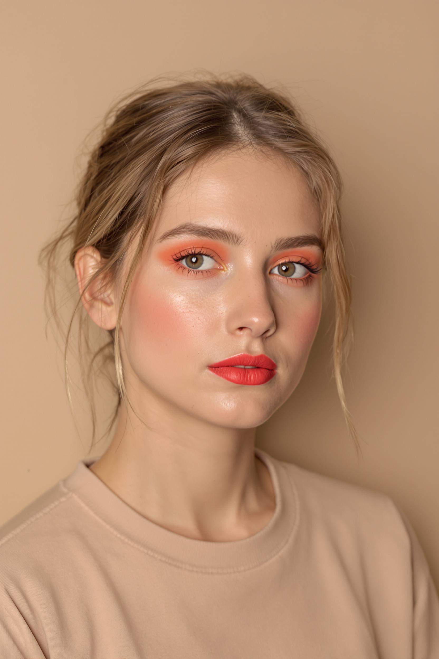 Женщина с яркими коралловыми губами и накрашенными глазами в светло-бежевой гамме, крупный план. Кожа идеально ровная и матовая, брови аккуратно уложены. Она одета в лаконичный бежевый топ, на фоне светлой бежевой циклорамы, взгляд прямо в камеру.