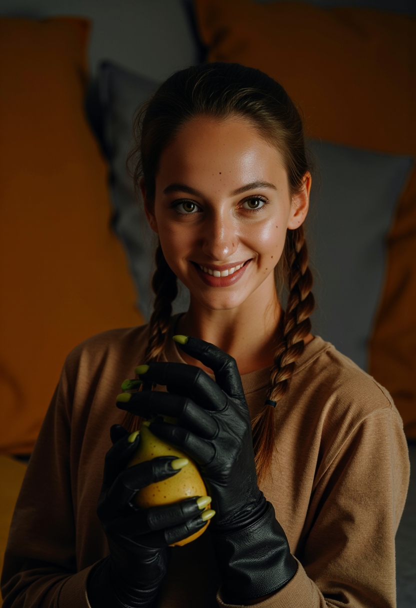 Женщина с заплетённой косой и перчатками в руках стоит на фоне груши, смотрит прямо в камеру, зал полутёмный
