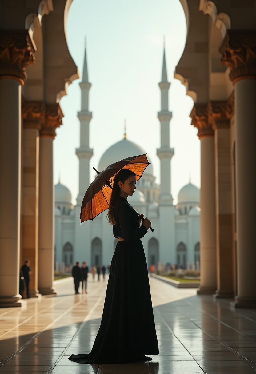 Женщина с зонтом стоит на фоне великолепной Кул-Шариф с её массивными минаретами и витражными окнами, смотрит прямо в камеру