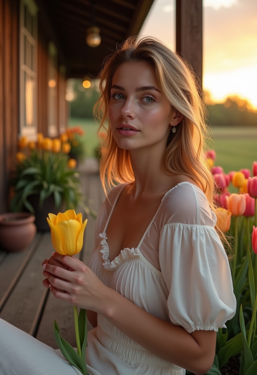 Женщина сидит на деревянном крыльце загородного дома, вокруг неё рассыпаны тюльпаны всех оттенков — от жёлтого до сиреневого. Она держит один цветок в руках, задумчиво глядя в сторону. Позади деревенский пейзаж, мягкий свет заката создаёт уютную атмосферу. Крупный план, акцент на текстуре лепестков и тёплом освещении.