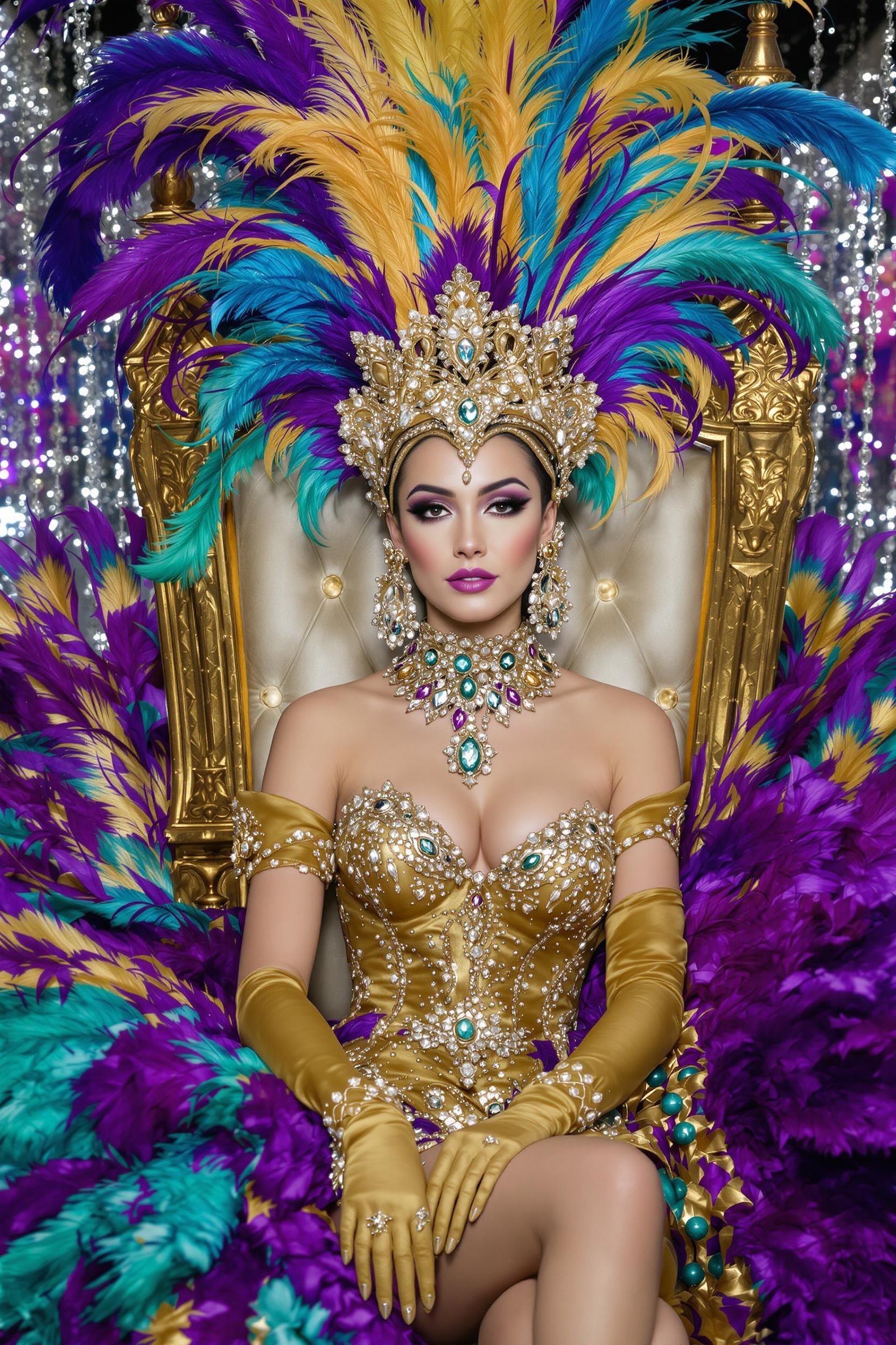 Женщина сидит на королевском троне, одетая в роскошный карнавальный наряд: золотой лиф с изысканной вышивкой, пышная юбка из фиолетовых и бирюзовых перьев, массивный венец из разноцветных перьев, атласные перчатки до локтя, средний план, смотрит в камеру, фон — блестящая сцена праздника.