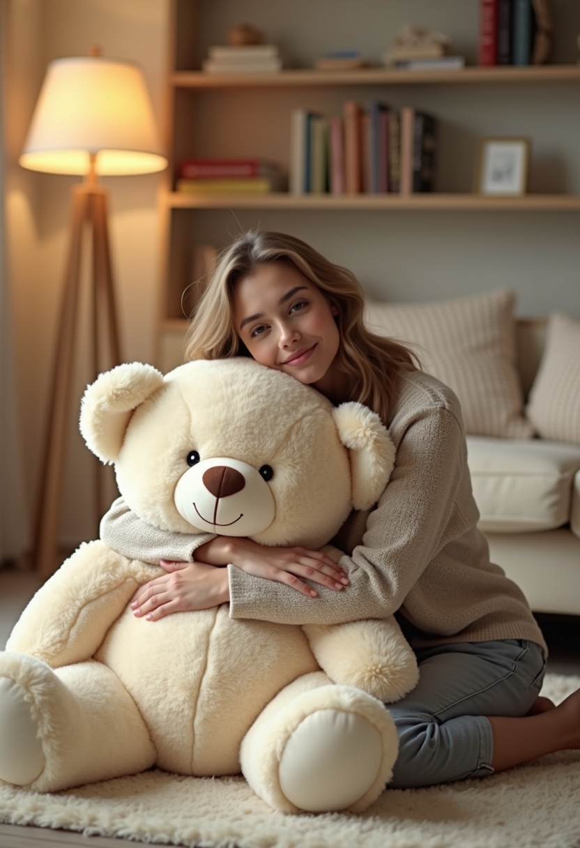 Женщина сидит на полу в уютной комнате, обнимая огромного плюшевого медведя кремового цвета. Её голова слегка наклонена, она смотрит прямо в камеру с тёплой улыбкой. Позади мягкий свет торшера, полки с книгами и декоративные подушки, создающие атмосферу уюта.