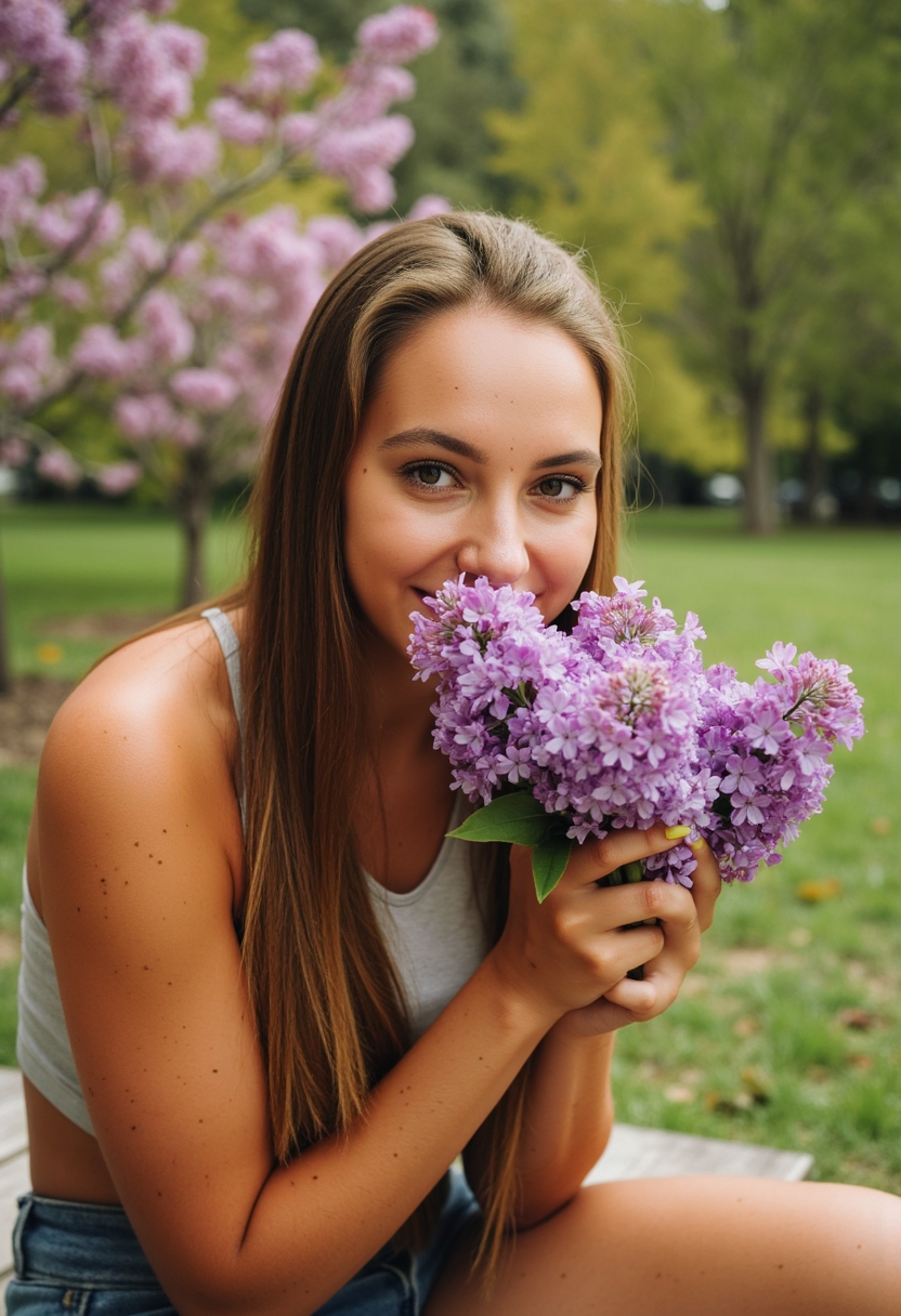Женщина сидит на скамейке в парке, её лицо выглядывает из-за пышного букета сирени, который она нежно прижимает к груди. Она улыбается, её пальцы касаются нежных лепестков. Позади весенние деревья в цвету, освещение тёплое и мягкое.