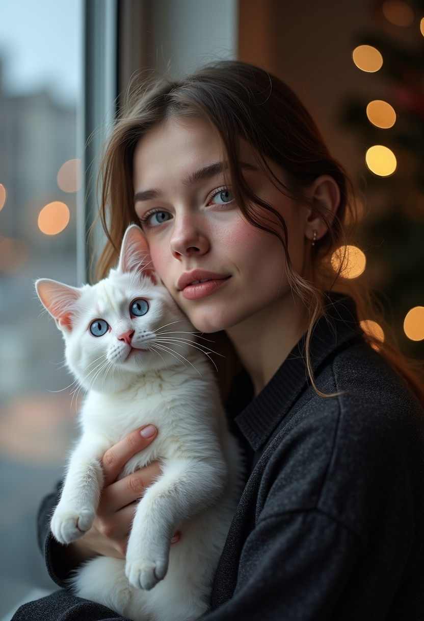 Женщина сидит у окна, её руки аккуратно обнимают белого кота с голубыми глазами. Он смотрит в камеру с любопытством, а она чуть наклоняет голову, глядя на него с нежностью. Позади городские огни, мягкое вечернее освещение.
