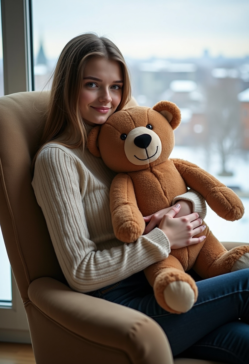 Женщина сидит в кресле-качалке, прижимая к себе плюшевого медведя практически своего роста. Её руки обнимают его за шею, а она сама смотрит в камеру с мечтательной улыбкой. Позади большой панорамный вид на заснеженный город, мягкий свет создаёт уютную атмосферу.