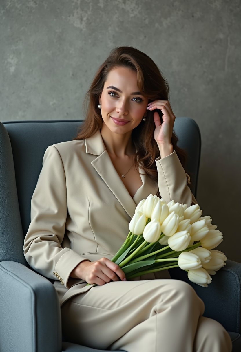 Женщина сидит в кресле серо-голубого цвета, с большим букетом белых тюльпанов в руках. Она смотрит в камеру с легкой улыбкой. Её поза расслаблена, одна рука касается пряди волос. На ней надет светло-бежевый оверсайз деловой костюм. Фон состоит из текстурированной бетонной стены в стиле лофт. В ушах жемучжные серьги.
