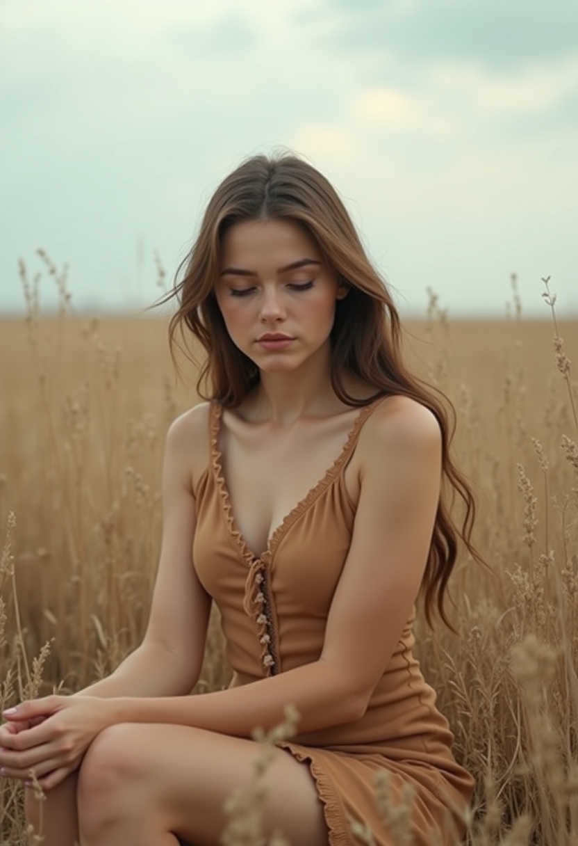 Женщина в платье цвета тёмной глины сидит на фоне пустого поля. Её взгляд задумчив, руки расслаблены. Пустое пространство вокруг с холодными оттенками серого и коричневого создаёт минималистичную, северную атмосферу. Крупный план.