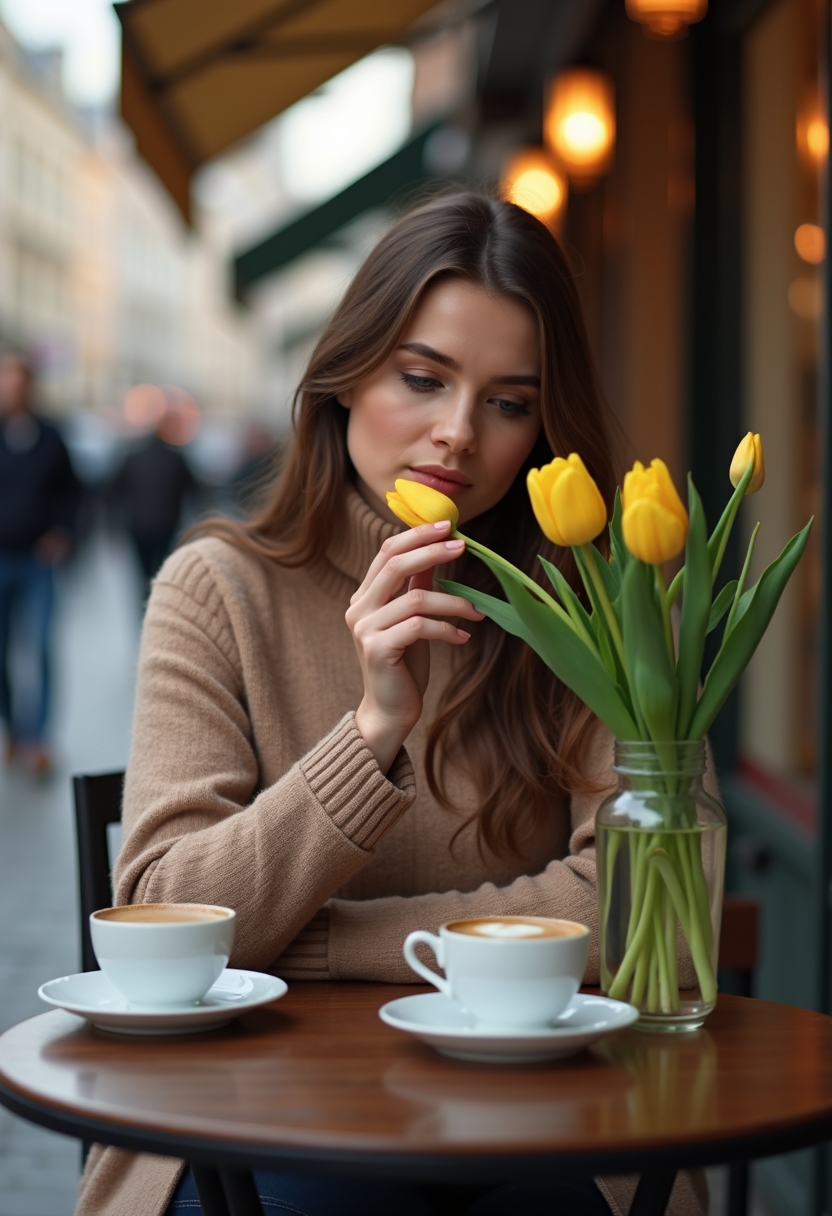 Женщина сидит за небольшим столиком уличного кафе, перед ней чашка кофе и изящная стеклянная ваза с тюльпанами. Она аккуратно держит один цветок, наклонившись, чтобы вдохнуть его аромат. Позади оживлённая улица, прохожие и мягкий тёплый свет фонарей. Крупный план, подчёркивающий детали и элегантность момента.