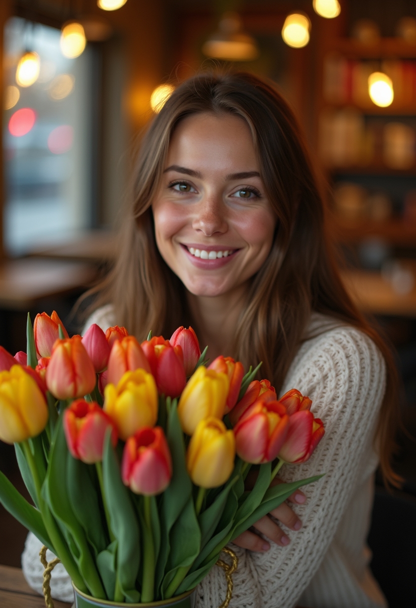 Женщина сидит за столиком в уютном кафе, её лицо выглядывает из-за огромного букета разноцветных тюльпанов. Она слегка склонила голову, глядя в камеру с нежной улыбкой. Позади мягкие огоньки гирлянд, создающие тёплую вечернюю атмосферу.