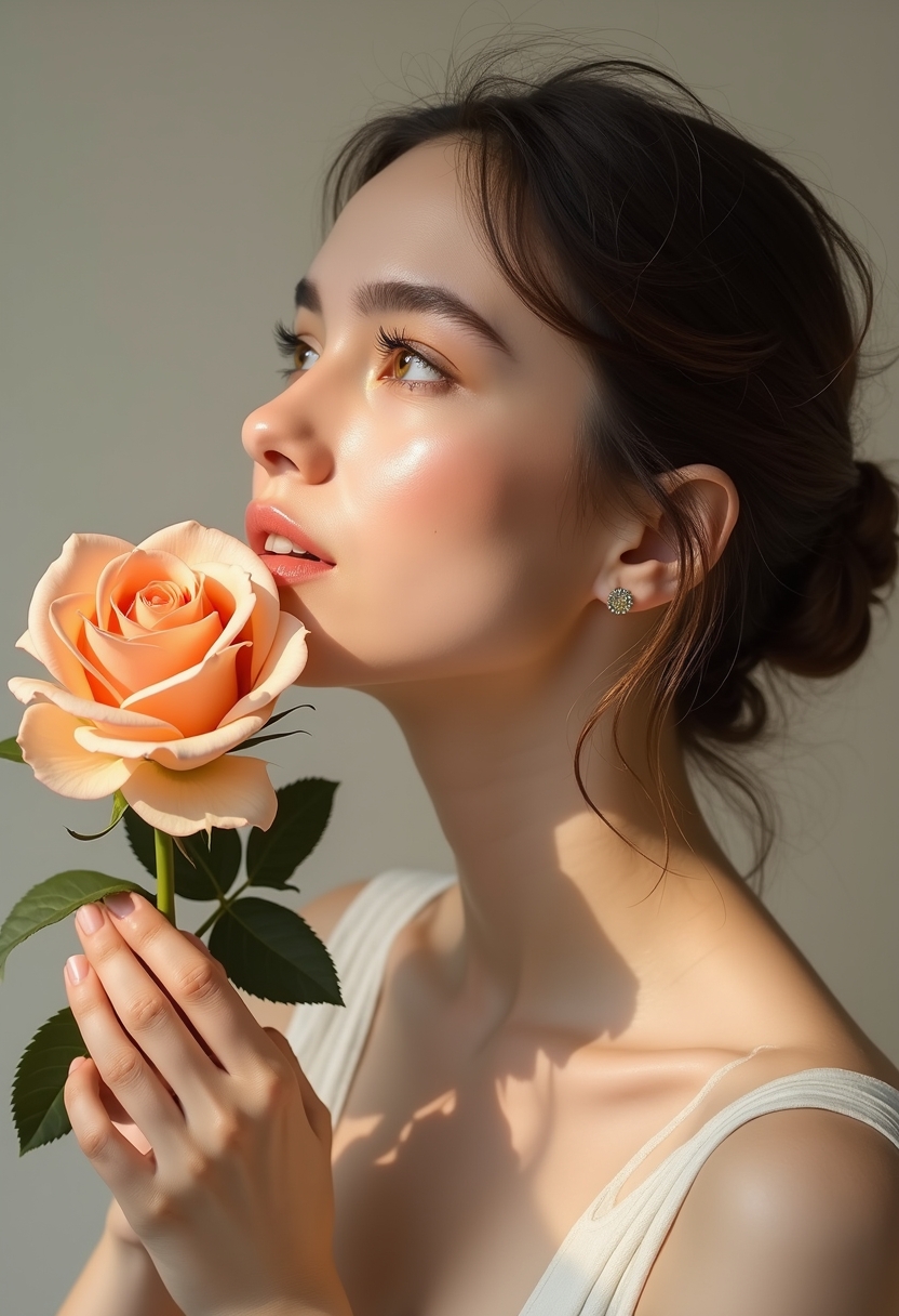 Женщина смотрит вверх, держа в руках розу нежно-персикового цвета, слегка касаясь её лепестков губами. Позади нейтральный фон с лёгкими тенями, подчёркивающими нежность образа. Крупный план, акцент на чувственности и утончённости.