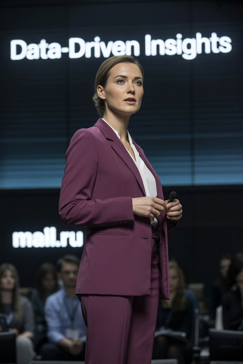 Женщина-спикер на конференционной сцене, одета в деловой брючный костюм глубокого бордового цвета и строгую белую рубашку без лишних деталей. Держит микрофон, серьезно смотрит в камеру в процессе аргументированного объяснения. Вокруг тёмная атмосфера, четкие прожектора, позади логотип Mail.ru, размытые силуэты слушателей, средний план.