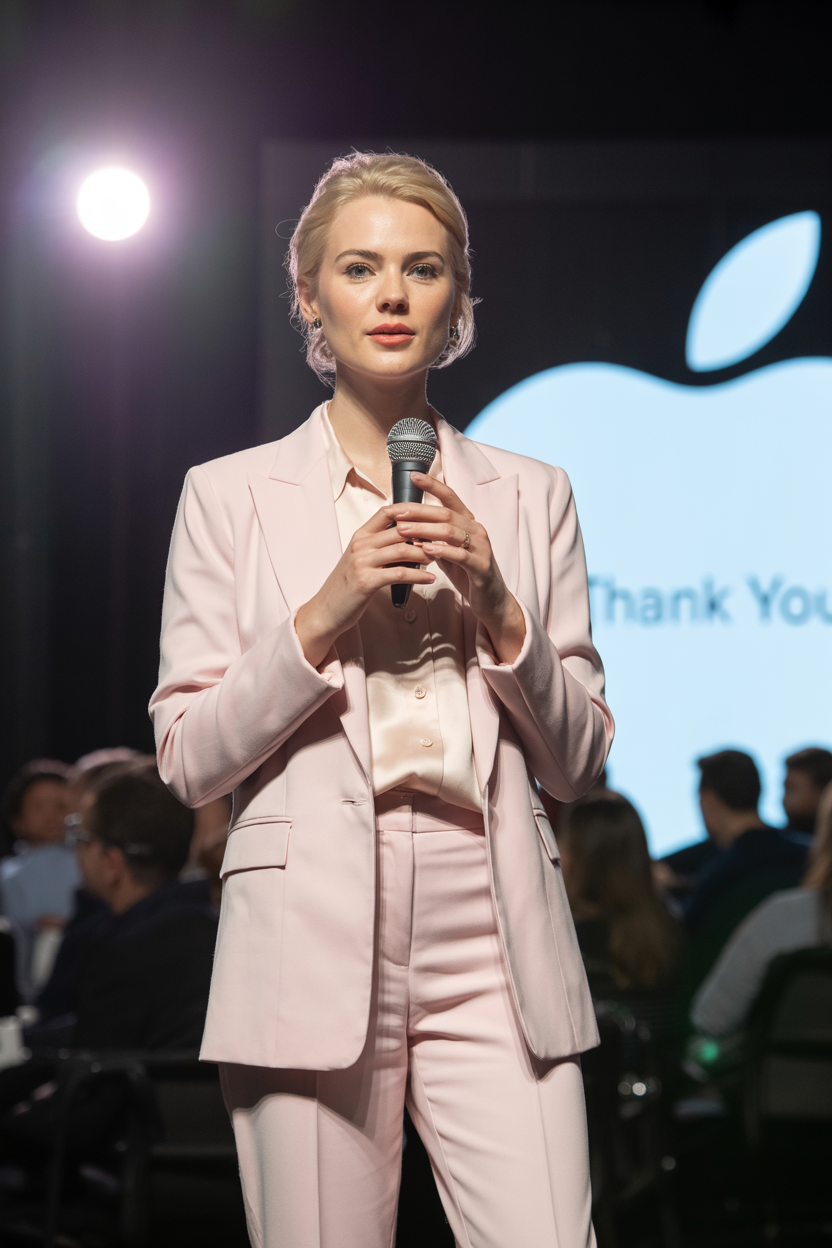 Женщина-спикер на сцене конференции, одета в изящный светло-розовый брючный костюм с классическими прямыми брюками и свободной рубашкой сливочного цвета. Держит микрофон обеими руками, смотрит в камеру, вовлечённо разговаривает. Чёткий свет прожекторов, сзади логотип Apple, размытые силуэты слушателей, средний план.