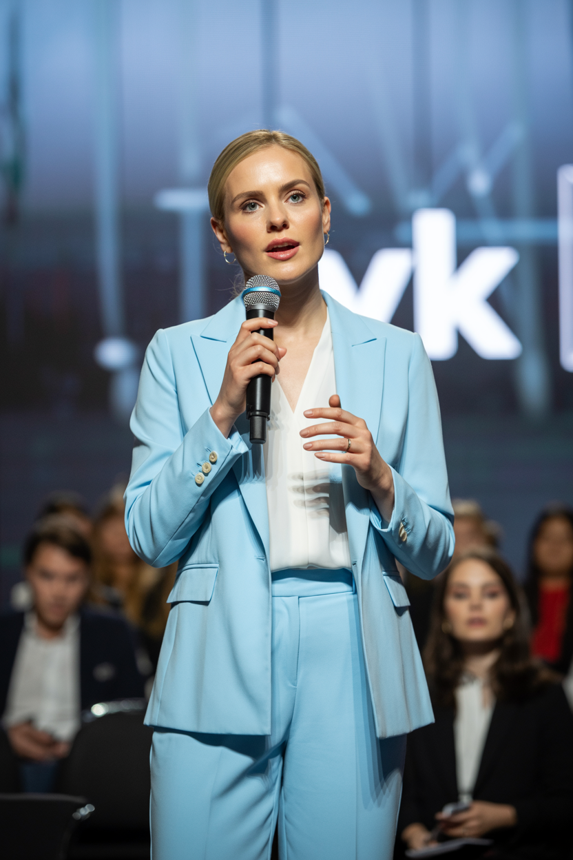 Женщина-спикер на сцене конференции, одета в лаконичный светло-голубой брючный костюм без лишних аксессуаров, под пиджаком однотонная белая блуза. Она держит микрофон и смотрит прямо в камеру в момент активного обсуждения. На светлом фоне размытые слушатели и логотип VK, средний план.