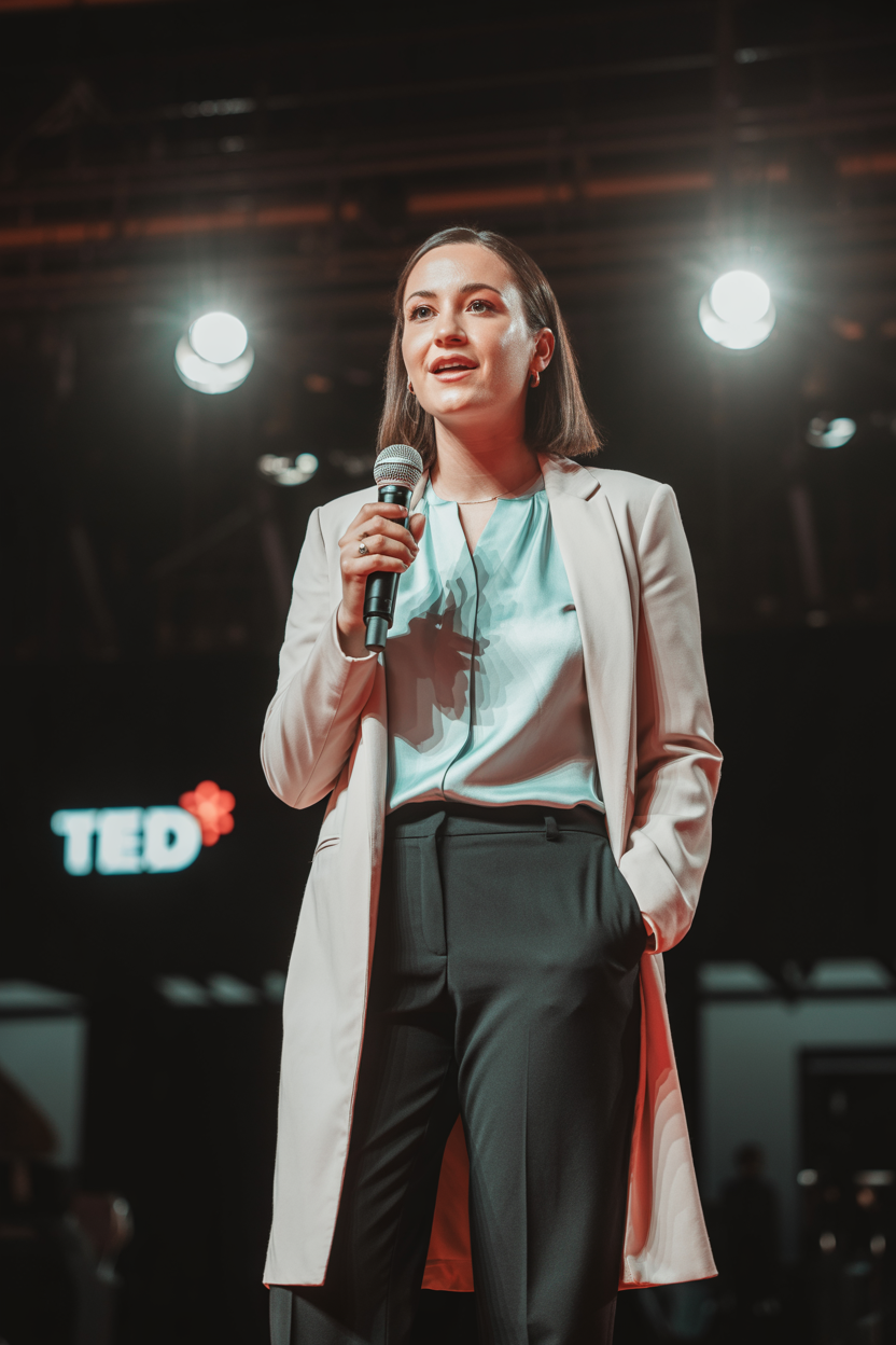 Женщина-спикер на сцене конференции, одета в стильный светло-бежевый удлинённый жакет и черные офисные брюки, нежно-голубая блуза с мягким воротом. Держит микрофон одной рукой, воодушевленно смотрит в камеру, разговаривает. Яркие прожектора в темном зале, сзади логотип TED, размытая публика, средний план.