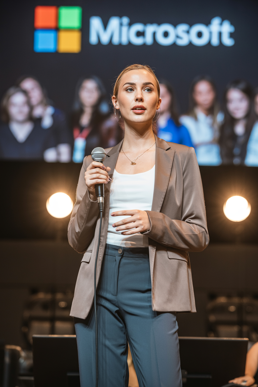 Женщина-спикер на сцене конференции, одета в стильный светло-коричневый жакет с узкими лацканами и белую майку без рукавов, прямые тёмно-синие брюки. Уверенно держит микрофон, смотрит в камеру во время объяснения. Яркие прожектора, сзади логотип Microsoft и размытая деловая публика, средний план.