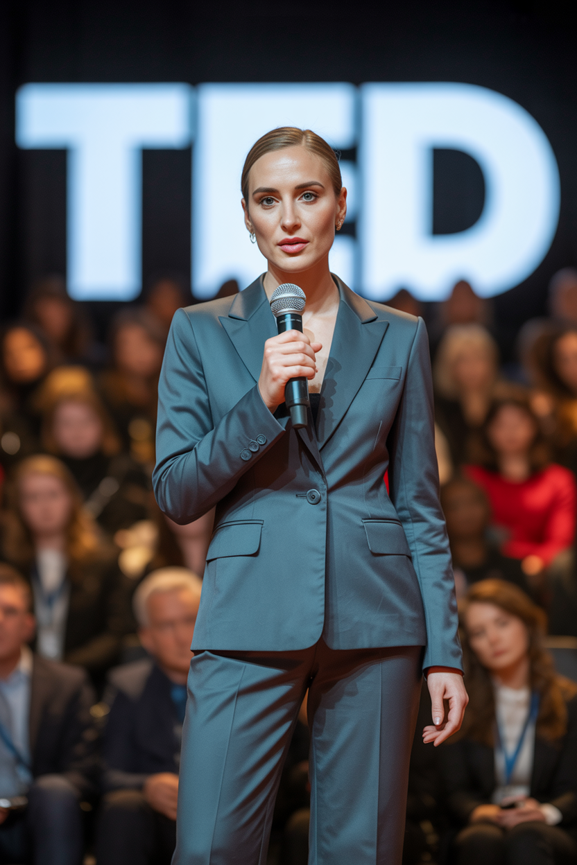 Женщина-спикер на сцене конференции в классическом графитовом костюме с прямыми брюками и лаконичным топом цвета мокрого асфальта, держит микрофон в правой руке и уверенно смотрит в камеру во время объяснения. Светлый фон, за спиной логотип TED и размытая аудитория, средний план.