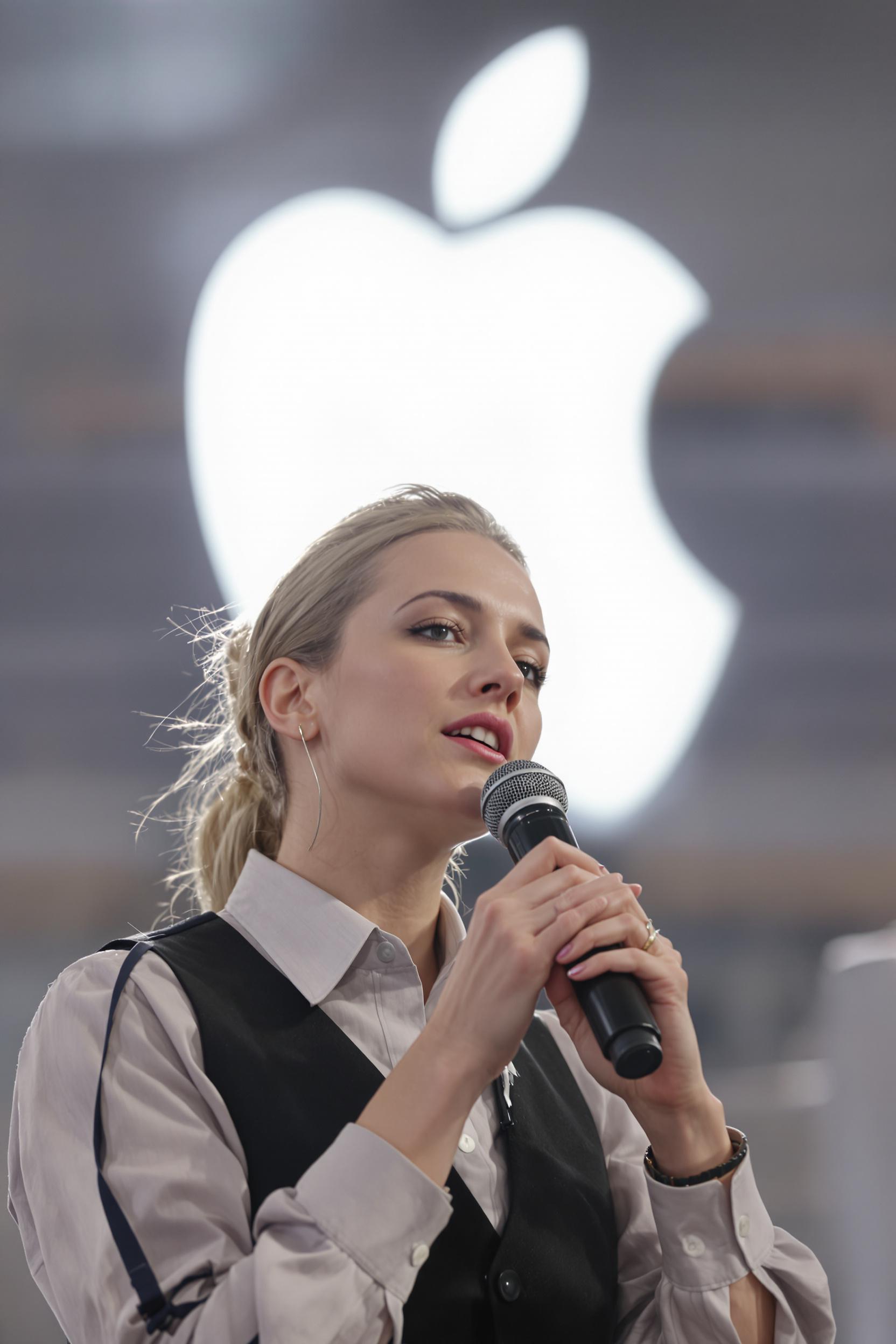 Женщина-спикер в светло-серой рубашке и строгом чёрном жилете, удерживает микрофон возле рта, смотрит в камеру в процессе эмоционального обсуждения. Яркие прожектора, позади логотип Apple, размытая публика, средний план.
