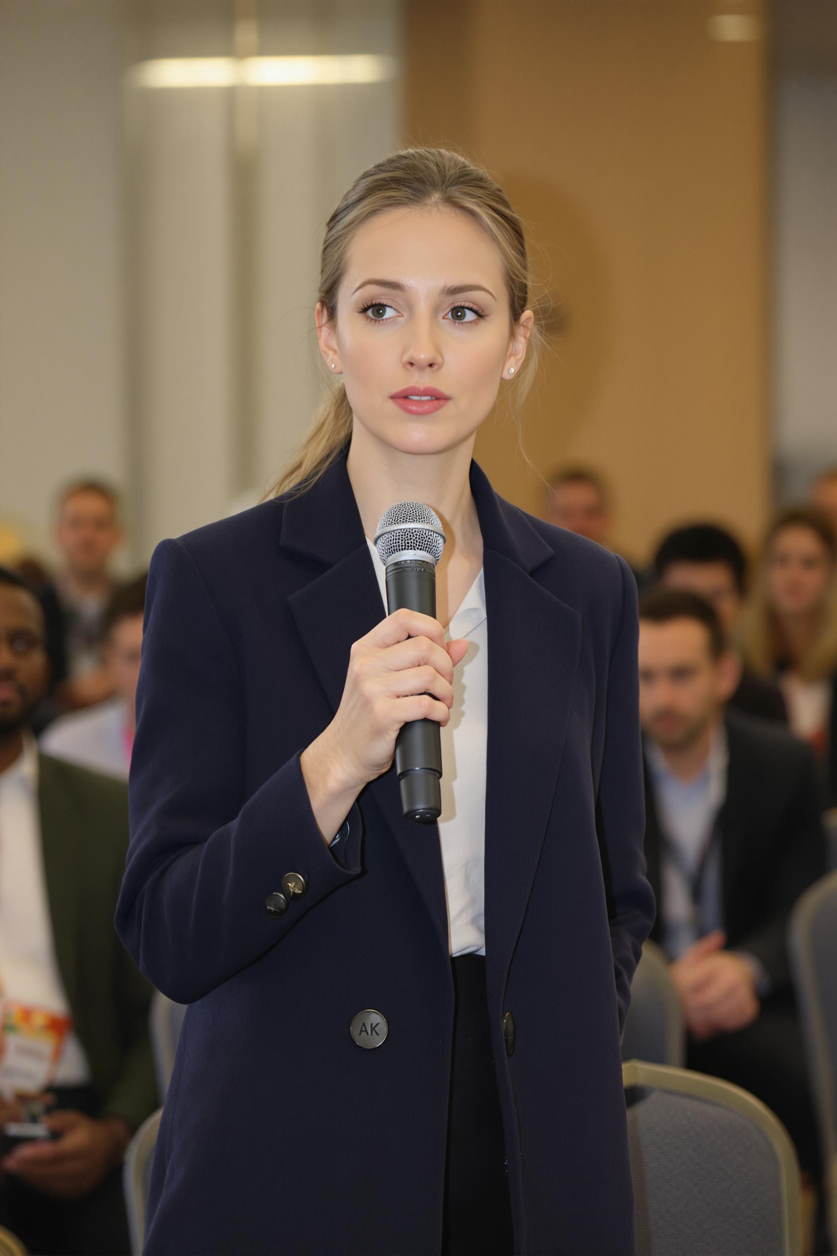 Женщина-спикер в строгом серо-голубом костюме с жакетом и белой рубашкой, стоит у трибуны с микрофоном, смотрит прямо в камеру, вокруг видны силуэты слушателей и деловой фон конференции. Средний план, ощущение профессионализма и вовлечённости.