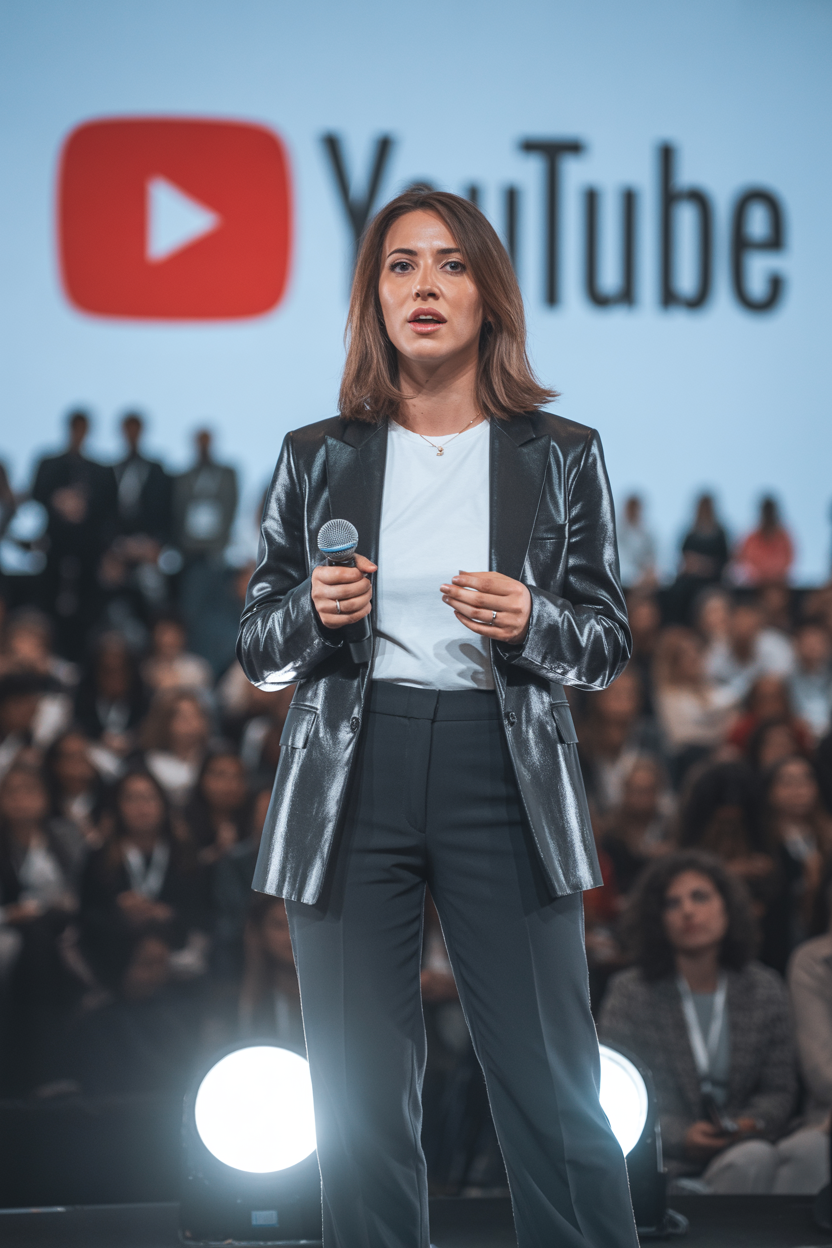 Женщина-спикер выступает на конференционной сцене, одета в строгий пиджак цвета мокрого асфальта, прямые тёмные брюки и белоснежную футболку без принта. Держит микрофон, смотрит прямо в камеру, активно сообщает мысли. Яркие прожектора, позади логотип YouTube и нечеткая толпа, средний план.