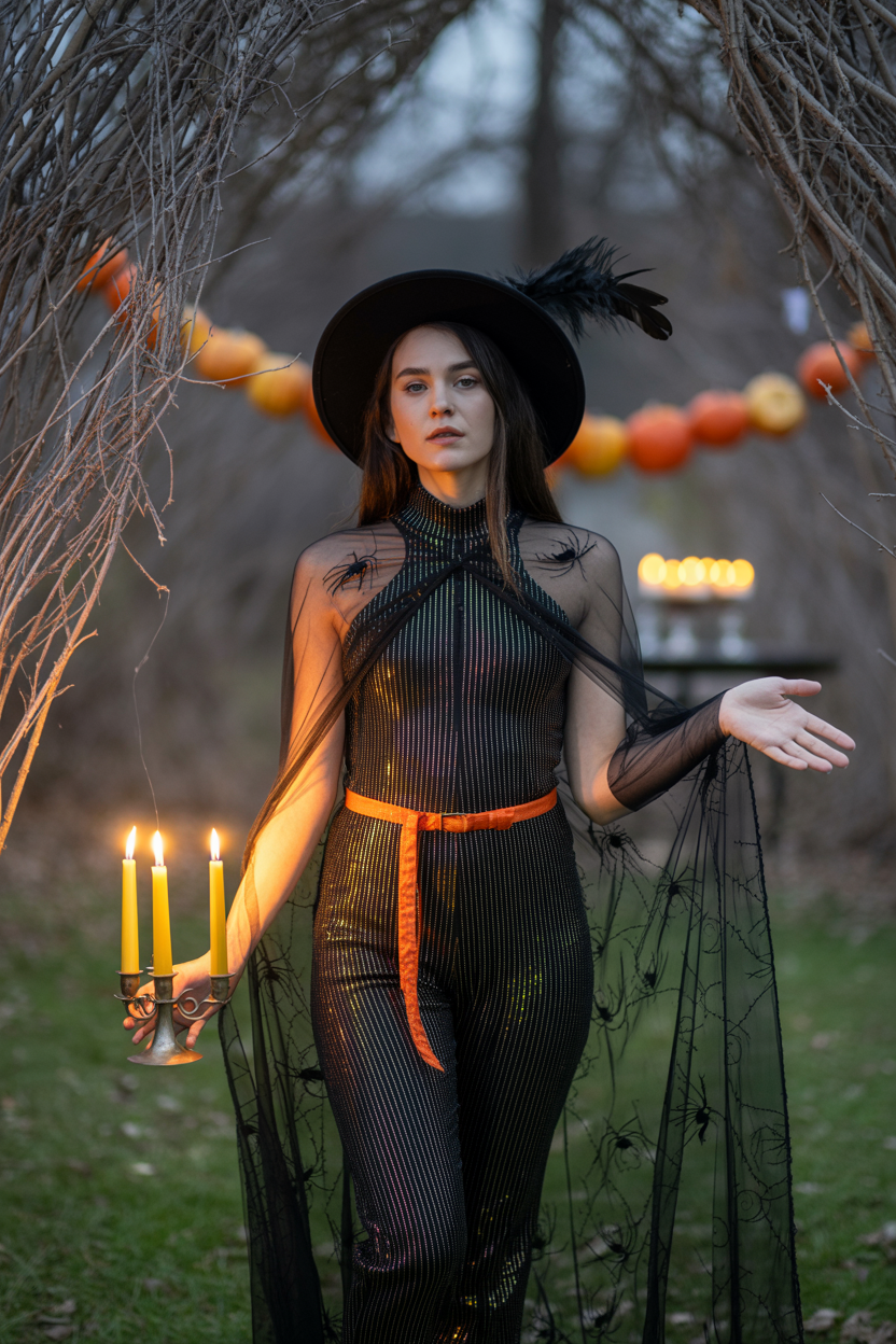Женщина среди осенних ветвей, облачена в облегающий чёрный комбинезон с золотыми пайетками, поверх — длинная полупрозрачная накидка с узором из паутин и ярко-оранжевый пояс, на шляпе — перо ворона, она держит в руке светящийся канделябр и смотрит в камеру, вторая рука вытянута, словно приглашая в ночь Хэллоуина, фон украшен гирляндой из тыкв.