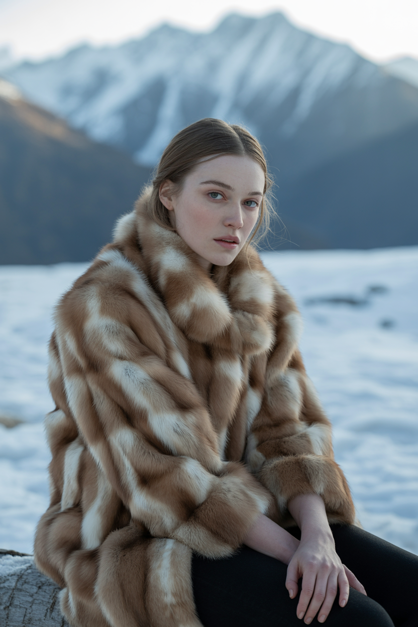 Примерить образ на себеЖенщина среди заснеженных гор, в роскошной соболиной шубе теплого орехового оттенка с массивным воротником. В среднем плане она слегка полусидит на снежном бревне, смотрит в камеру, волосы распущены, макияж естественный. Атмосфера винтажной фотосессии с акцентом на натуральном мехе и ретро-стиле.