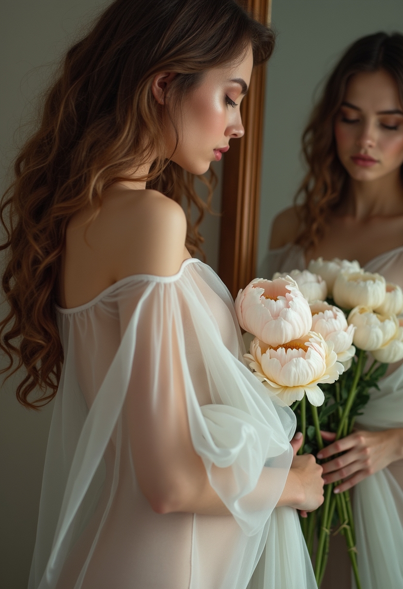 Женщина стоит боком у зеркала, почти обнажённая, прижимая к телу крупный букет пионов, которые полностью скрывают грудь и бедра. Она смотрит в отражение, лицо слегка прикрыто волосами. Крупный план, подчёркивающий романтику и нежность.