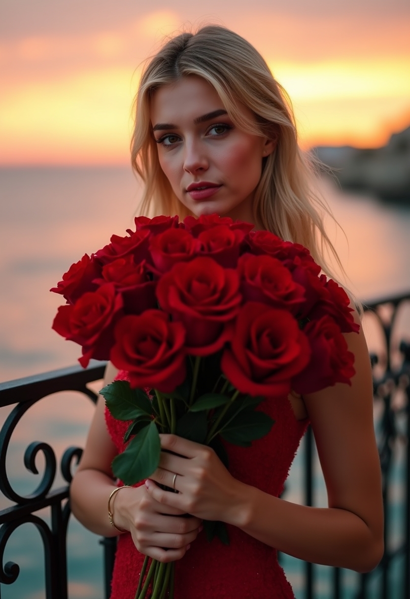 Женщина стоит на балконе с видом на море, в руках огромный букет ярко-красных роз. Она смотрит прямо в камеру с уверенным и романтичным выражением лица. Позади закатные цвета отражаются в волнах. Крупный план, создающий атмосферу романтического вечера.