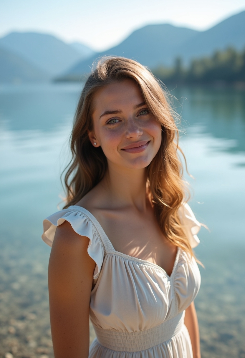 Женщина стоит на берегу озера Байкал, смотря в камеру, с легкой улыбкой на лице. Вокруг нее отражается живописный пейзаж: кристально чистая вода, нежные волны и величественные горы на фоне. Она одета в легкое летнее платье светлого цвета, которое слегка развевается на ветру. Солнечные лучи освещают ее лицо, создавая мягкое свечение. Фокус на лице женщины, создавая интимность и атмосферу спокойствия. Крупный план.