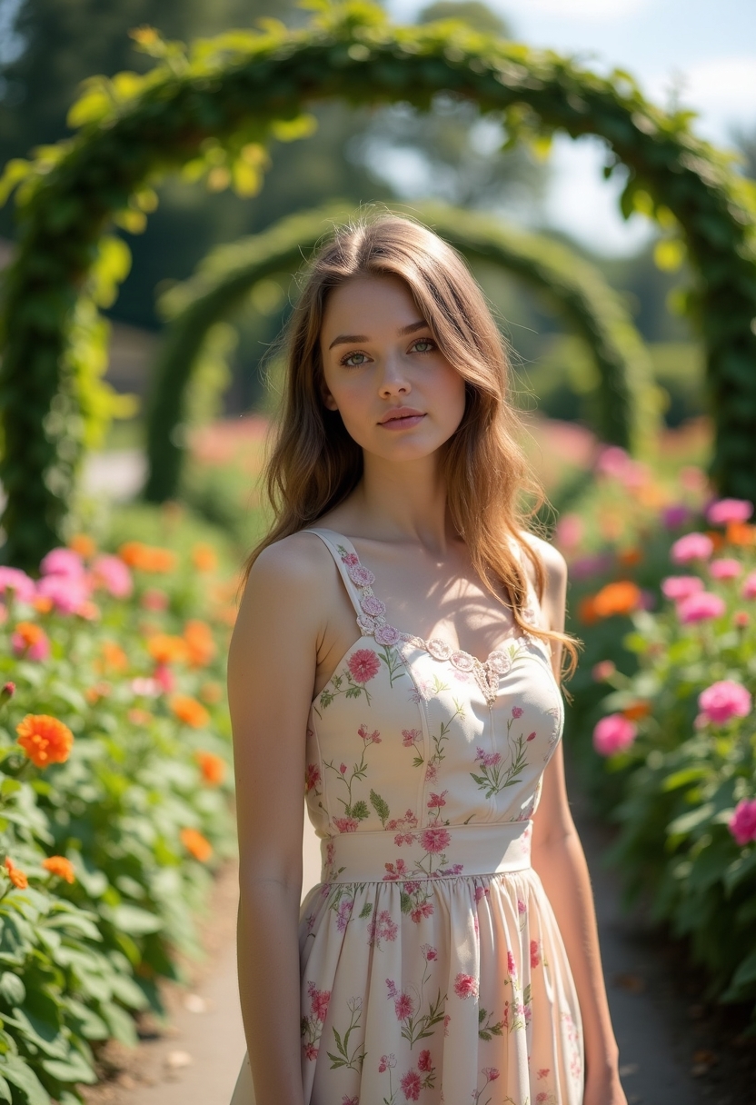 Женщина стоит на фоне Ботанического сада Петра Великого в Санкт-Петербурге. Она одета в легкое весеннее платье с нежными цветочными узорами. Её волосы свободно падают на плечи, а на лице — лёгкий макияж, подчеркивающий глаза. Позади неё расцветают яркие цветы и зелень растений, на фоне — ухоженные дорожки сада и арки с пышными лианами. Свет мягкий, естественный, создавая атмосферу спокойствия и умиротворения. Крупный план акцентирует внимание на её лице и окружении.