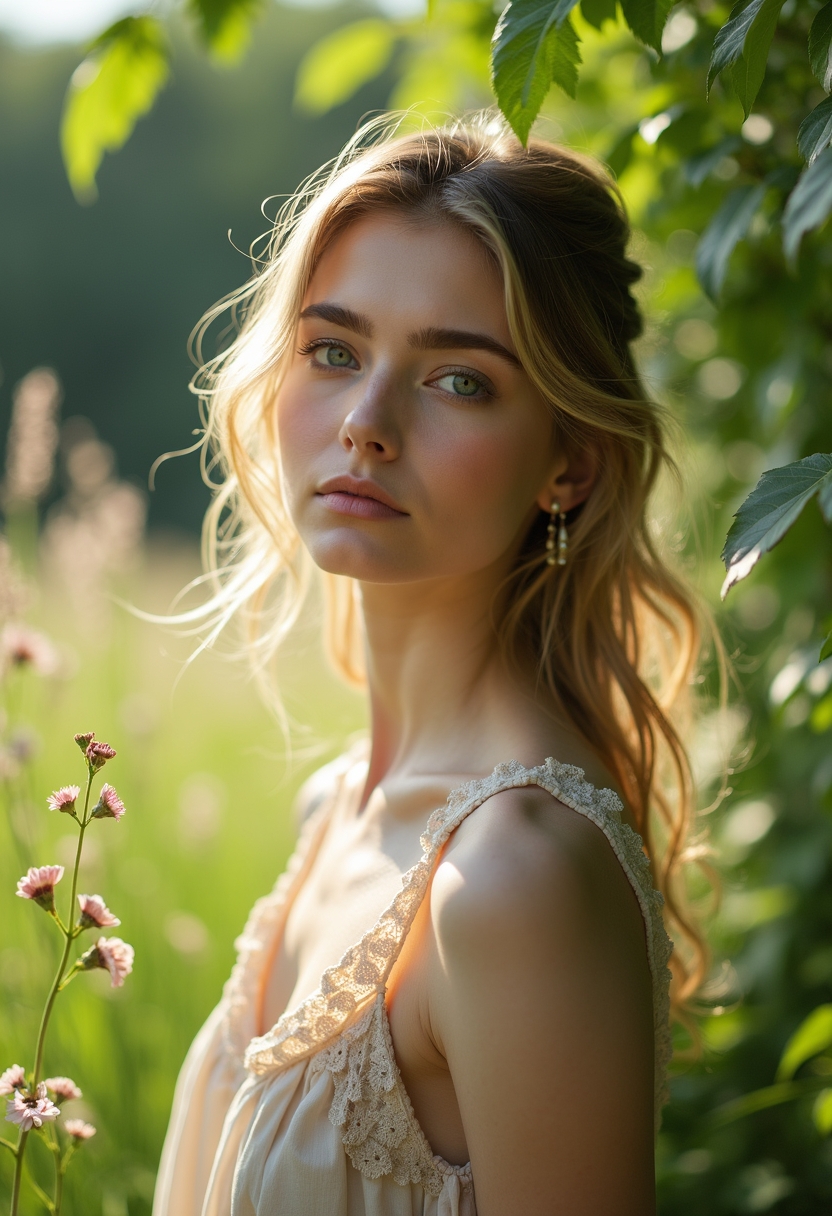 Женщина стоит на фоне Центрального сибирского ботанического сада, её лицо хорошо освещено мягким солнечным светом, подчеркивающим черты. Она одета в легкое летнее платье нежного цвета, которое плавно обтекает ее фигуру, создавая гармонию с окружающей природой. На заднем плане видны разнообразные растения и цветы, создающие насыщенный зелёный фон, который контрастирует с её нарядом. Фотография сделана в крупном плане, обеспечивая ясное отображение лица и окружающего зелёного пейзажа.