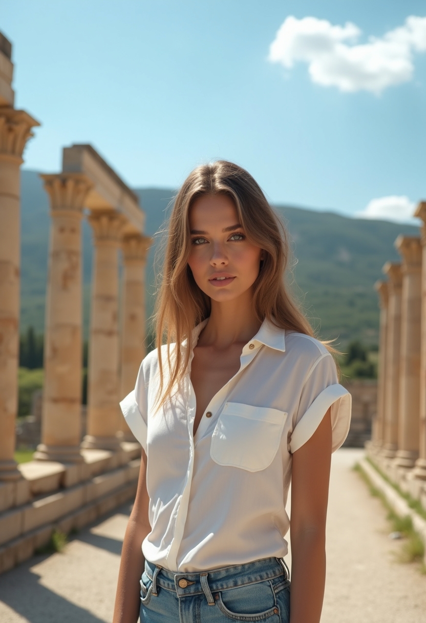 Женщина стоит на фоне Долины храмов на Сицилии. Она одета в лёгкое летнее платье, которое плавно колышется на ветру. Светит яркое солнце, создавая контраст между её нарядом и древними каменными колоннами храмов. Легкий макияж подчеркивает её черты лица, а волосы свободно спадают на плечи. Фон заполняют величественные храмы с древнегреческой архитектурой, окруженные зелеными холмами. Небо ярко-голубое с несколькими облаками, что придает изображению атмосферу ясного дня. Женщина смотрит прямо в камеру с уверенностью и спокойствием. Крупный план.