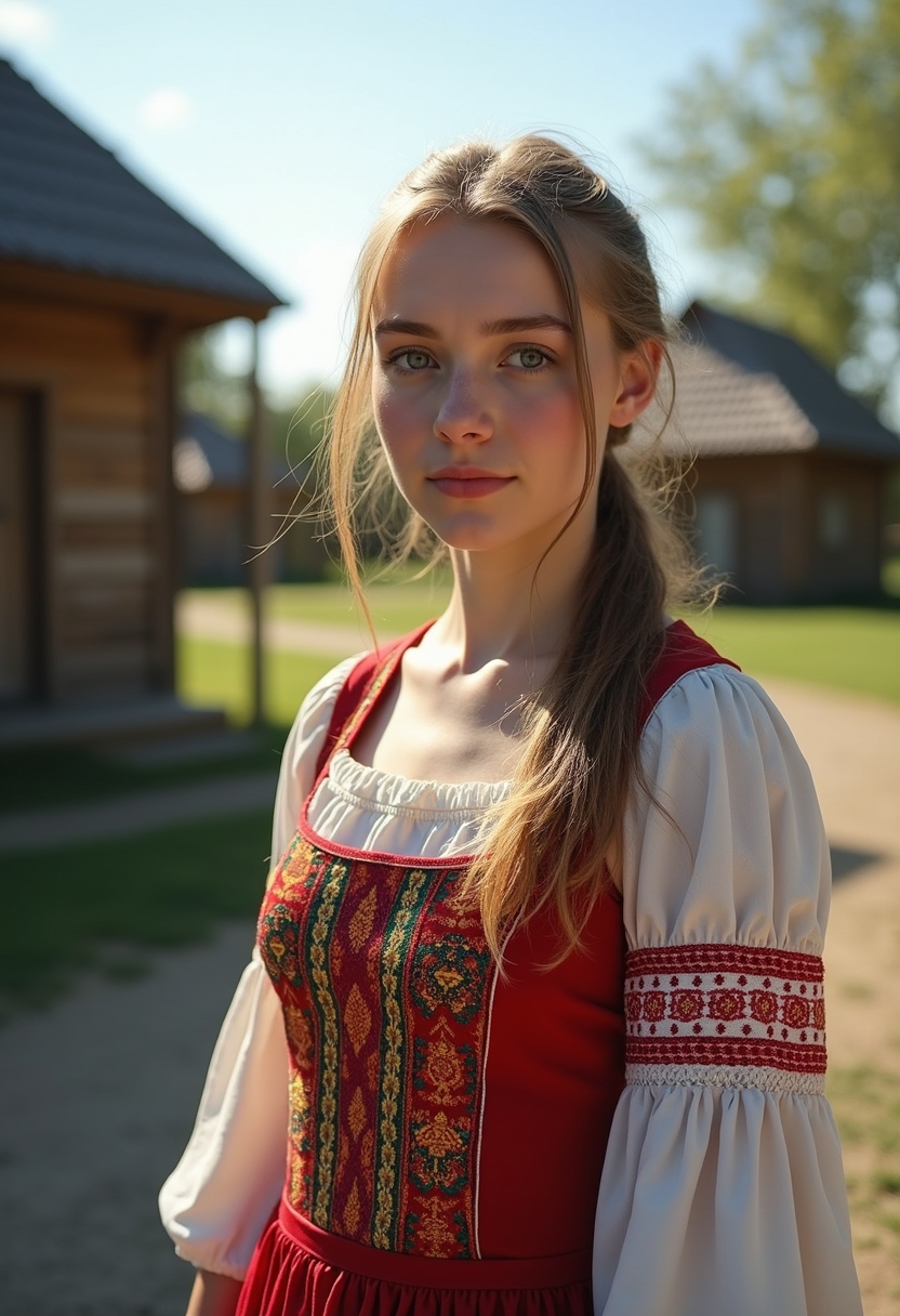 Женщина стоит на фоне Этнографического комплекса «Тальцы», крупный план. Она одета в традиционное русское платье с яркими узорами, волосы аккуратно собраны. На фоне видны деревянные постройки, характерные для сибирской архитектуры, а также окружающий пейзаж с зелеными деревьями и легким покрытием земли. Свет падает на лицо, подчеркивая её черты и придавая ощущение теплоты. Женщина смотрит прямо в камеру, её выражение лица спокойное и уверенное.