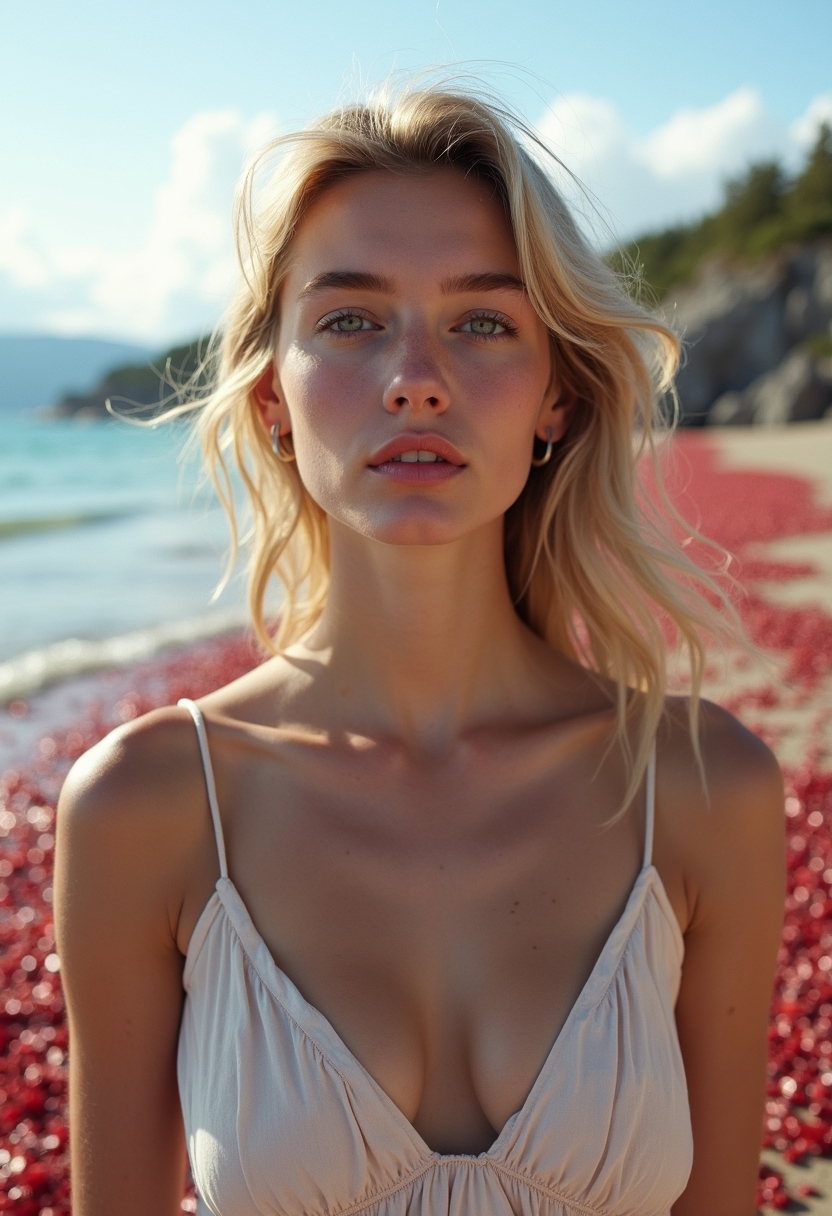 Женщина стоит на фоне Гранатового пляжа на Байкале, её лицо крупным планом, выражающее спокойствие и умиротворение. На ней лёгкое летнее платье светлого цвета, которое развевается на ветру. Солнце освещает её лицо, создавая мягкие тени, а за ней видны яркие красные гранаты и прозрачная вода Байкала...