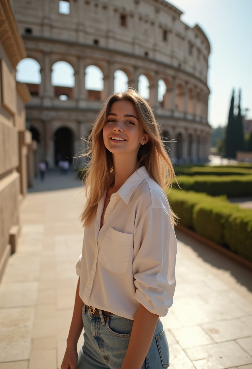 Женщина стоит на фоне Колизея, одетая в легкое летнее платье пастельных тонов. Освещение мягкое, солнечное, с теплым оттенком, создающим атмосферу уюта. Она позирует, слегка наклонив голову и печатая легкую улыбку, ее волосы свободно спадают по плечам. Колизей majestically возвышается позади, с его древними арками и каменными стенами, которые придают кадру исторический контекст. Пол мраморный, слегка тусклый, на фоне можно увидеть элементы зеленого пространства, дополняющие композицию. Крупный план.