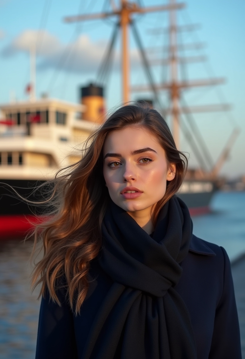 Женщина стоит на фоне крейсера «Аврора» в Санкт-Петербурге, крупный план. Она одета в элегантное пальто темно-синего цвета и шарф, осенний ветер нежно колышет её волосы. Лицо утопает в мягком свете заката, который освещает место нахождения. На заднем плане виден исторический корабль, детали которого четко выделяются на фоне голубого неба. Атмосфера спокойствия и величия, подчеркивающая историческую значимость места.