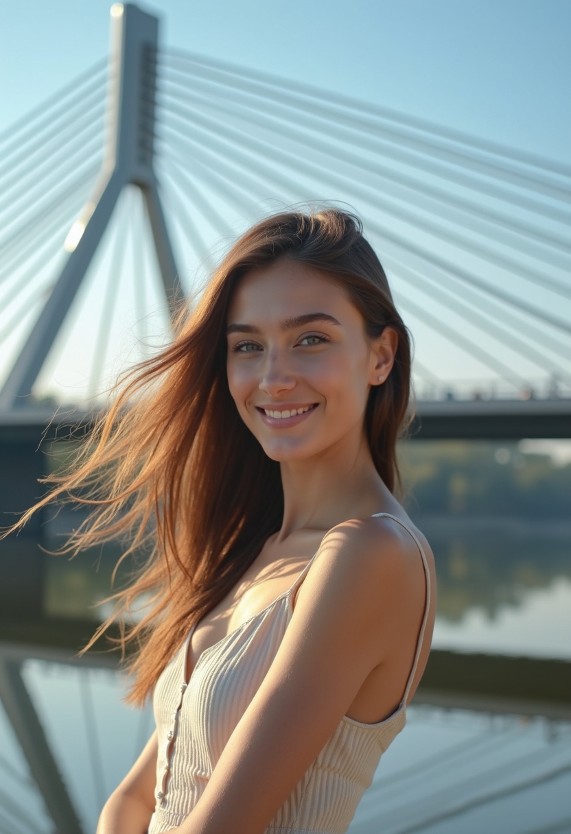 Женщина стоит на фоне Новосибирского метромоста, на ней светлое платье, волосы развеваются на ветру. Она улыбается, смотря в камеру, ее лицо хорошо освещено солнечными лучами. Мост величественно протянулся за ней, с четкими линиями архитектуры и отражениями в воде под ним. Небо ясное и голубое, создающее контраст с серыми конструкциями моста. Крупный план подчеркивает детали лица, выражение радости и уверенности.