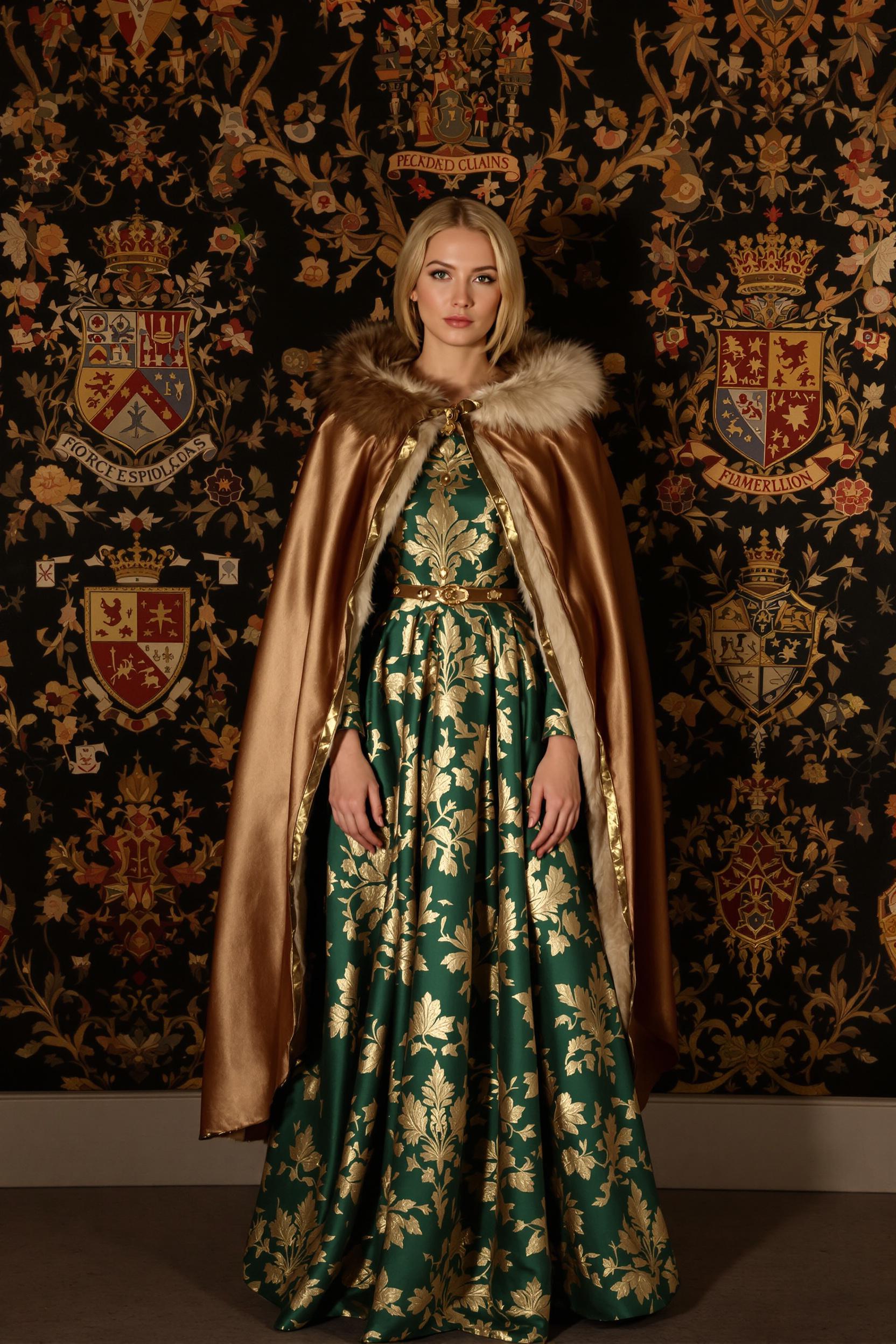 Женщина стоит на фоне старинных гобеленов с гербами, одета в длинное зеленое платье с золотыми узорами, поверх — широкий плащ с меховой окантовкой, на плечах лёгкая накидка цвета меди. Женщина смотрит в камеру, свет тёплый и рассеянный.