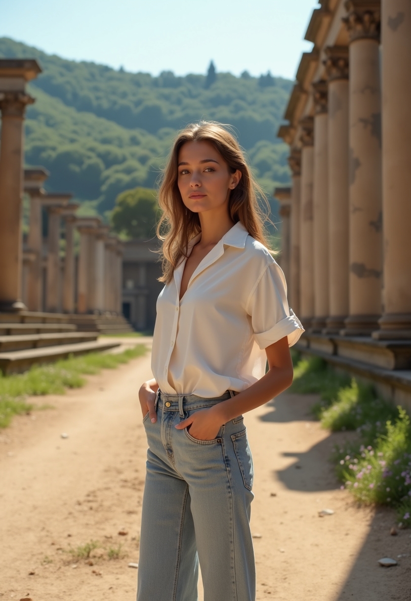 Женщина стоит на фоне Виллы Адриана, обладая уверенным и спокойным выражением лица. Она одета в легкое летнее платье нежного пастельного оттенка, которое аккуратно развевается на ветру. Позади нее величественные руины древнеримской виллы, с колоннами и арками, окруженные зелеными холмами. Освещение мягкое, утреннее, что создает теплую атмосферу и подчеркивает детали ее наряда. Женщина смотрит чуть в сторону, создавая эффект глубины в кадре, а вокруг играет тень и свет. Пол — земля, покрытая мелкой травой и декоративными цветами, что добавляет живописности этому историческому месту.