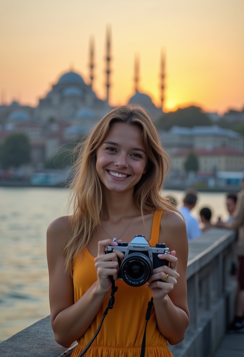 Женщина стоит на фоне закатного неба, с видом на мечети и Босфор, в руках у неё камера. Она улыбается и смотрит прямо в объектив. Крупный план, атмосфера туристической лёгкости и вдохновения.