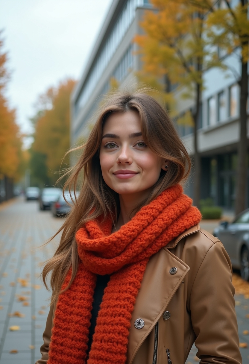Женщина стоит на фоне зданий Новосибирского Академгородка, на ней стильный повседневный наряд, яркий шарф обрамляет её лицо. Она уверенно смотрит в камеру, на её лице легкая улыбка. Вокруг видны современные здания университетов и лабораторий, на заднем плане гуляют университетские деревья с зелеными листьями, отражая спокойствие академической атмосферы. Светлая прохлада осеннего дня создает мягкое освещение, подчеркивающее черты её лица. Крупный план позволяет увидеть детали её образа и окружения.