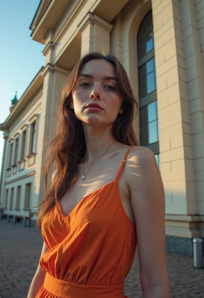 Женщина стоит на фоне здания Новосибирского академического молодёжного театра «Глобус», облаченная в стильное платье, подчеркивающее её фигуру. Днем, при естественном освещении, солнечные лучи касаются её лица, создавая мягкий свет и выделяя яркие детали платья. Архитектура театра с характерными элементами фассадов и большими окнами обрамляет её силуэт. Крупный план, фокус на лице и платье, создающий ощущение гармонии с окружающей средой.