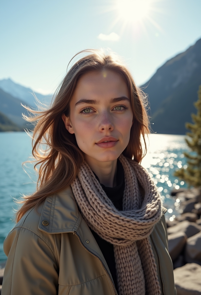 Женщина стоит на Мыс Хобой на Байкале, ее лицо и выражение эмоций четко видны на крупном плане. На ней легкая куртка и теплый шарф, что подчеркивает свежесть воздуха. Вокруг нее величественные скалы, обрамляющие живописный берег озера. Небо над головой ясное, с легкими облаками, отражающимися в спокойной воде Байкала. Солнечный свет мягко освещает ее лицо, придавая кадру теплую атмосферу. Мягкий ветер играет с ее волосами, добавляя динамики в пейзаж.