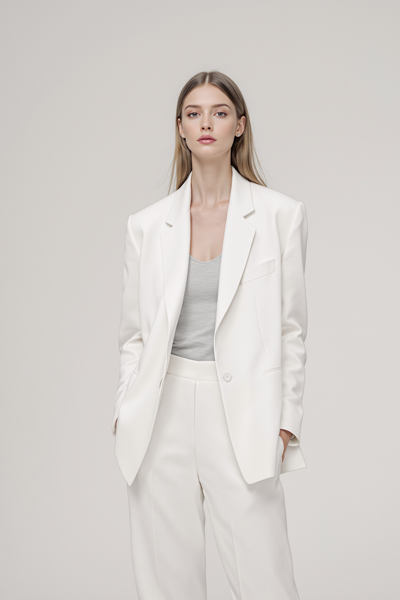 Женщина стоит на подиуме. На ней белый лаконичный брючный костюм с прямыми линиями, под пиджаком тонкий серый топ, смотрит прямо в камеру. Минималистичный бледный фон, мягкое равномерное освещение, кадр среднем плане.