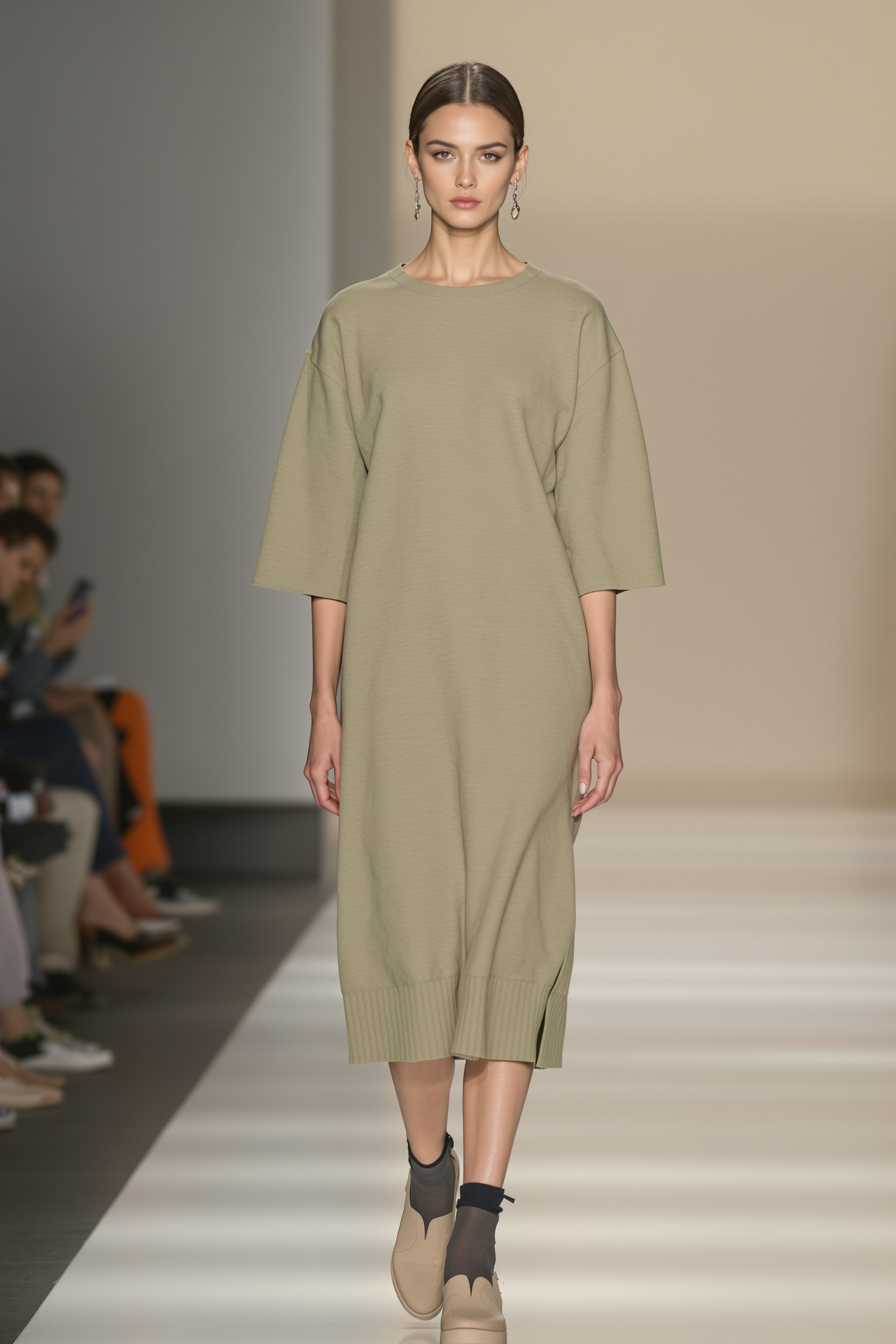 Женщина стоит на подиуме. На ней лаконичное трикотажное платье-миди светло-оливкового оттенка, широкий рукав до локтя, прямой крой. На фоне минималистичный интерьер, мягкое рассеянное освещение, крупный план, смотрит прямо в камеру.