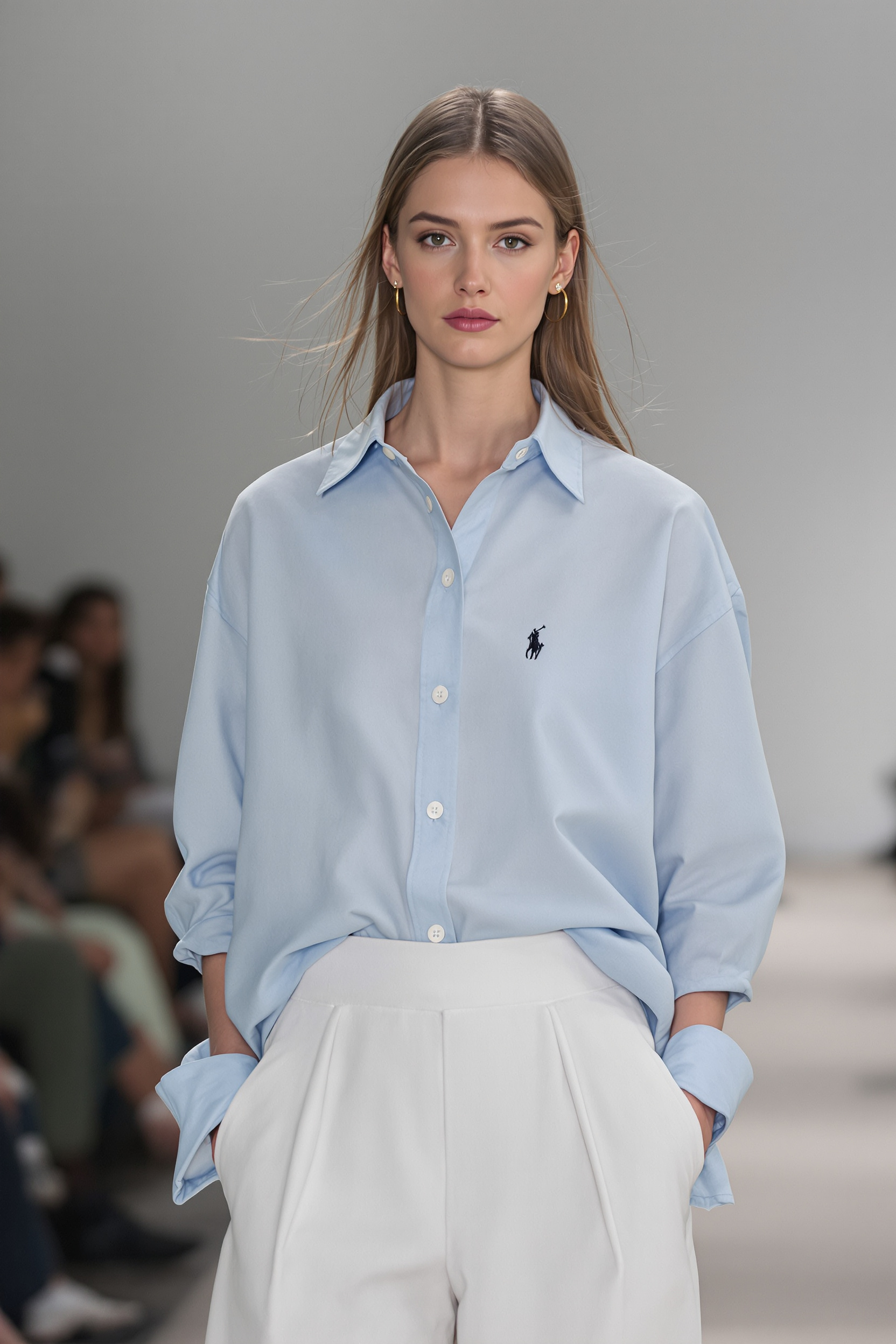 Женщина стоит на подиуме, ощущается стильный casual от Ralph Lauren: на ней светло-голубая рубашка оверсайз, аккуратно заправленная в белые укороченные брюки со стрелками. Минималистичный фон, мягкое освещение, смотрит прямо в камеру, средний план.