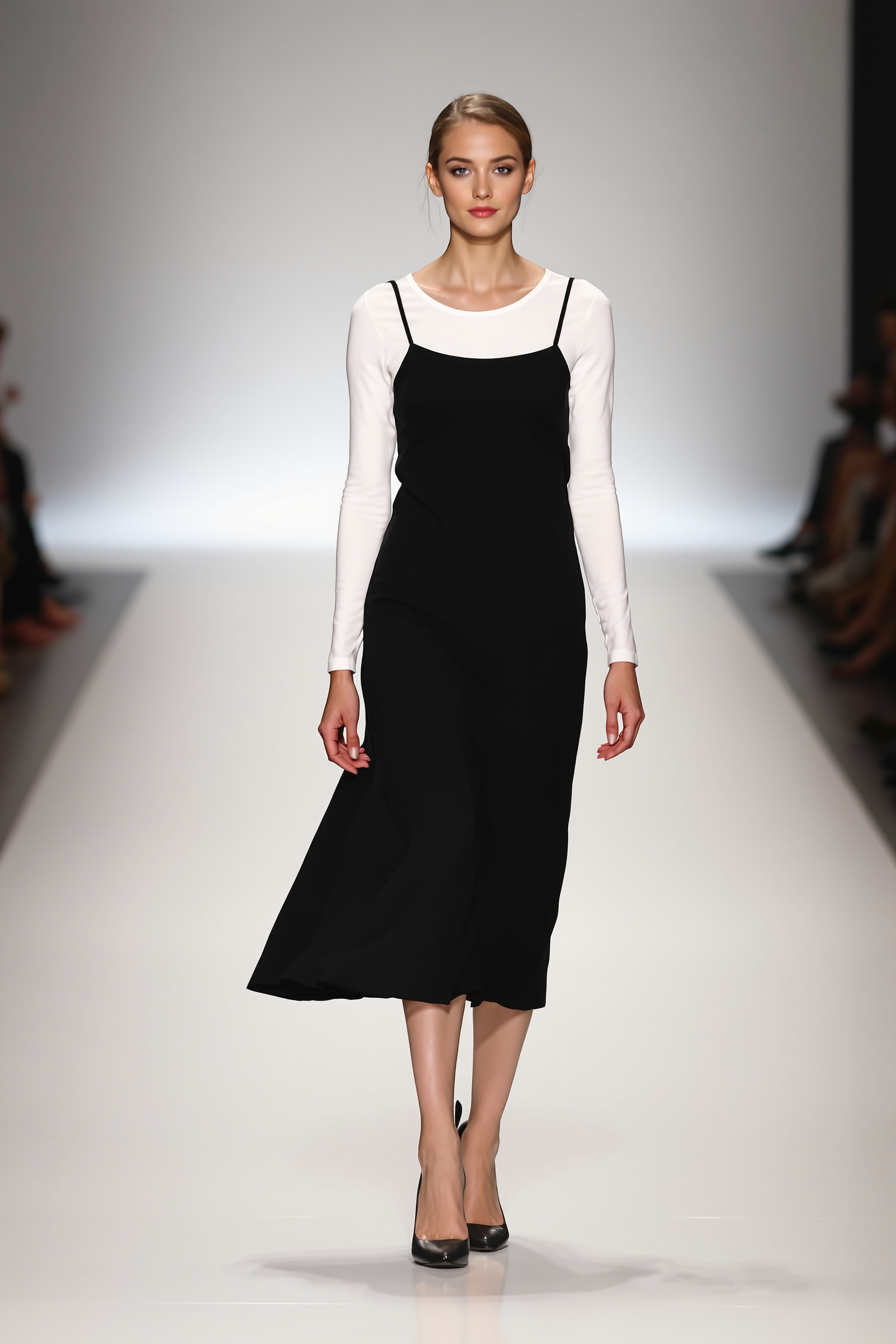 Женщина стоит на подиуме, уверенно смотрит в камеру. На ней минималистичный черный сарафан миди с тонкими бретелями, под ним белая базовая кофточка с длинным рукавом. Фон однородный, мягкое точечное освещение, средний план.