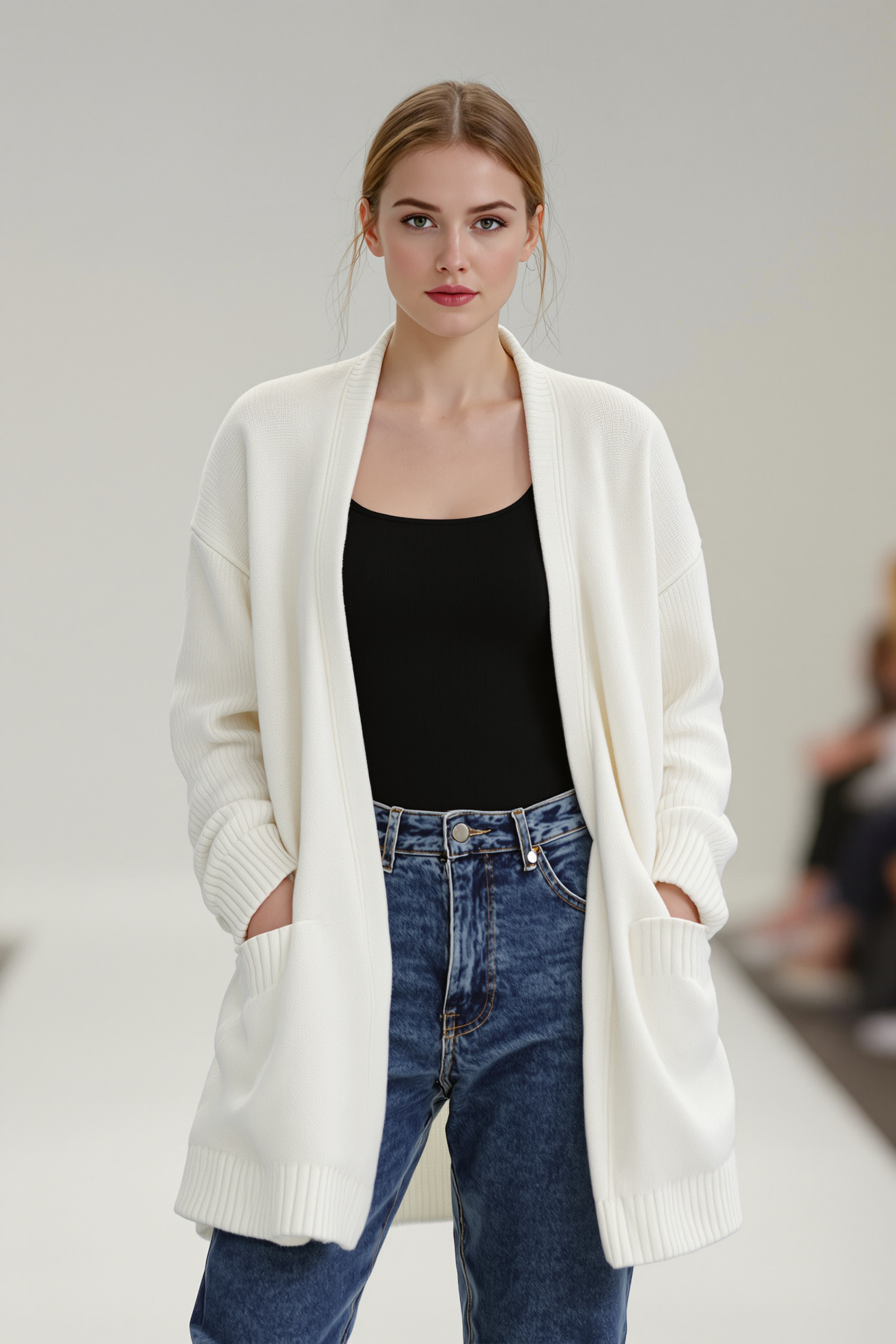 Женщина позирует на подиуме в молочном длинном кардигане, под ним – простая черная майка, прямые синие джинсы с высокой посадкой. Фон светлый и лаконичный, свет мягкий, взгляд направлен прямо в камеру, композиция средний план.