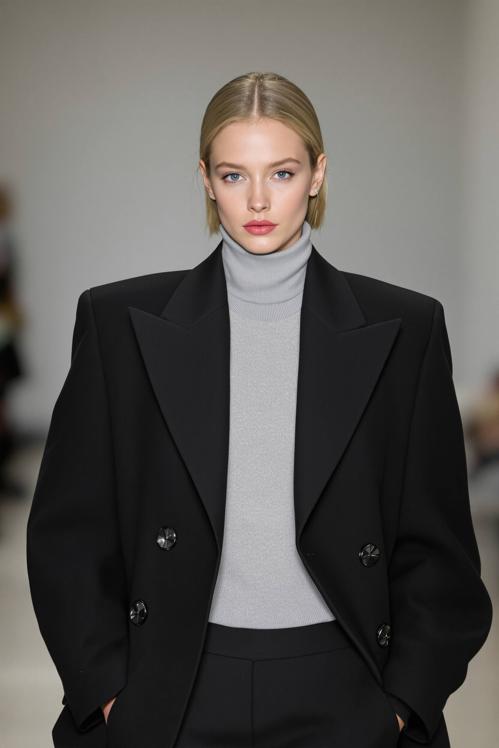 Женщина стоит на подиуме в образе от Balenciaga: объемный черный двубортный пиджак с массивными плечами, под ним светло-серая водолазка, лаконичные темные брюки, минималистичный нейтральный фон. Средний план, уверенный прямой взгляд в камеру.