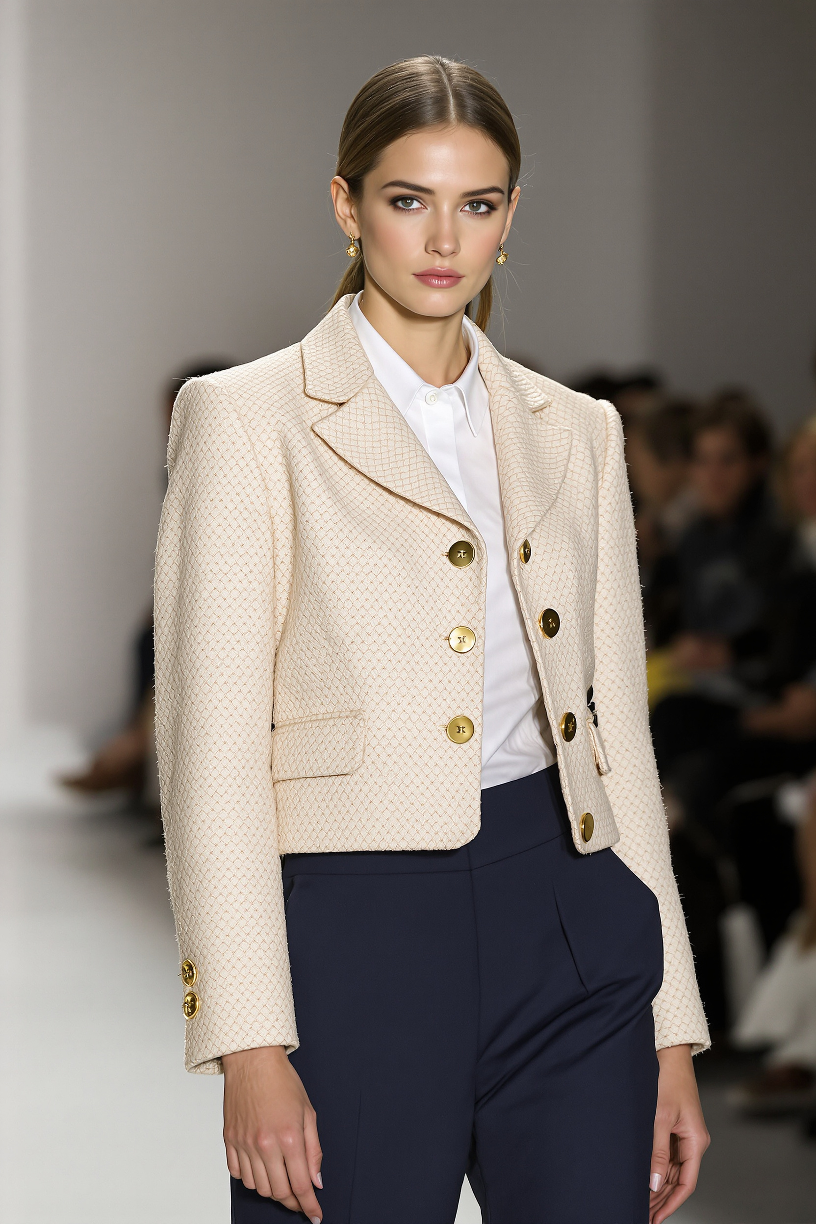 Женщина стоит на подиуме в образе от Chanel: твидовый короткий жакет кремового цвета с золотистыми пуговицами, под ним лаконичная белая блуза, прямые темно-синие брюки с высокой талией. Освещение мягкое, фон минималистичный, средний план, прямой взгляд.