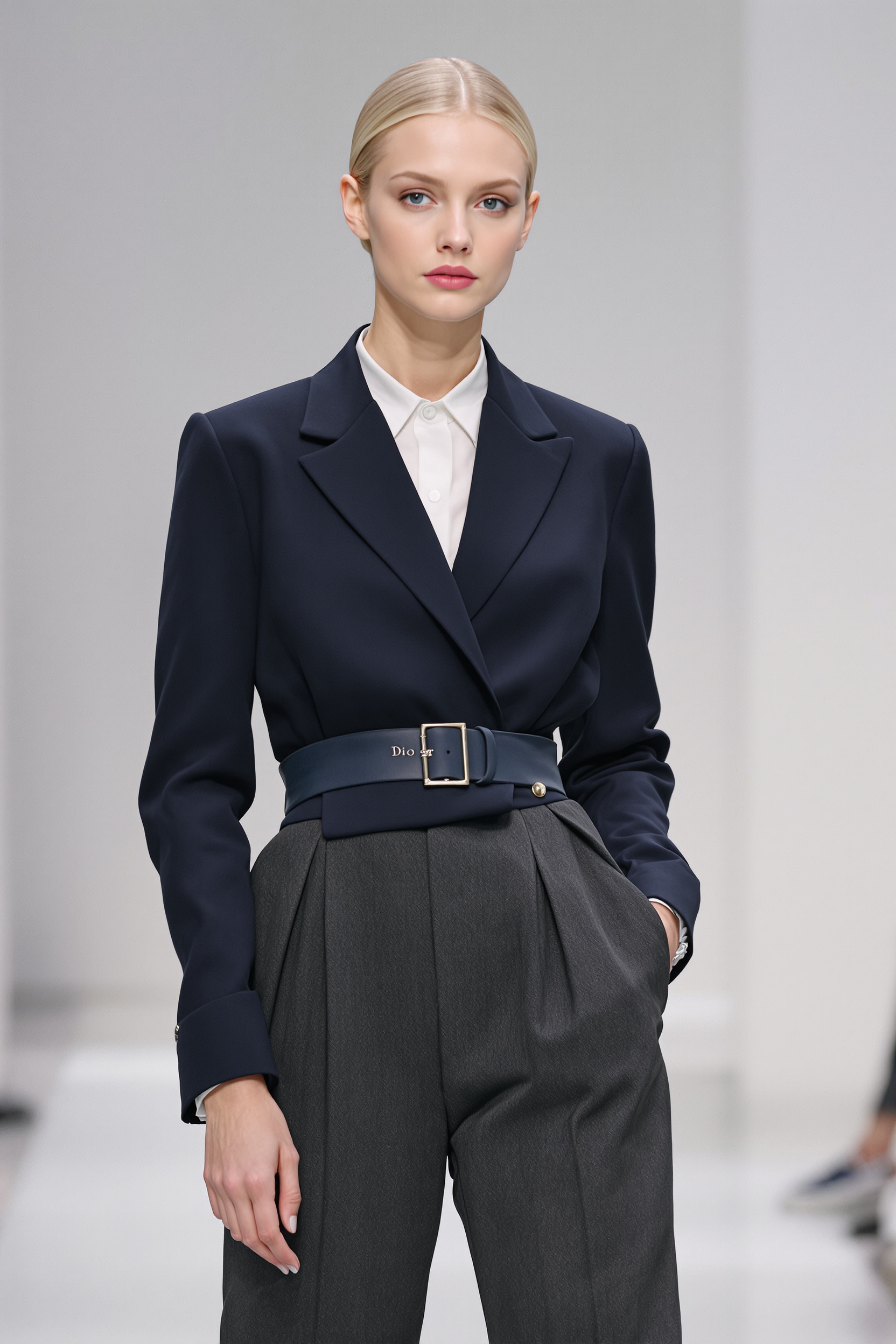 Женщина стоит на подиуме в образе от Dior: темно-синий жакет с акцентированной талией и тонким поясом, под ним светлая шелковая блуза, строгие серые брюки с защипами. Чистый минималистичный фон, мягкое равномерное освещение, средний план, прямой взгляд в камеру.